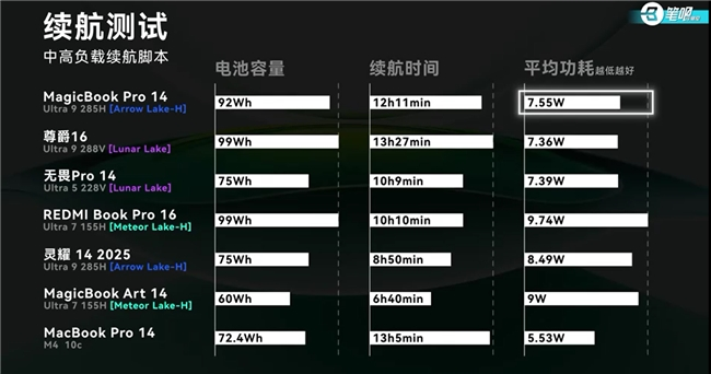 评测媒体总结认为,荣耀MagicBook Pro 14最惊艳的地方是超长续航,用Arrow Lake处理器做到了堪比MacBook的续航,同时它的性能释放以及日常场景的噪音控制也相当不错。