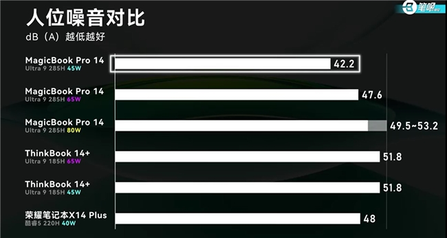 为了验证产品静音高性能表现,媒体还分别测试了多种日常实际场景下具体的噪音数值。在2.5K中画质预设下运行《原神》,荣耀MagicBook Pro 14可以跑到接近60帧,噪音41dB,明显低于同档竞品。而45W、65W定功耗下的噪音表现,也比其它产品低出好几个dB,消费者日常使用会有明显感知。