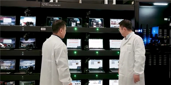 在软件自动化测试实验室里,荣耀自主研发了一套行业独一无二的PC自动化测试解决方案。测试人员只需要设置好不同调校参数的自动化脚本,再通过摄像头和大数据监控前后台技术指标,可同时实现成百上千台PC的自动测试。产品需要在这里通过多轮反复的大批量测试,实现调校最优。
