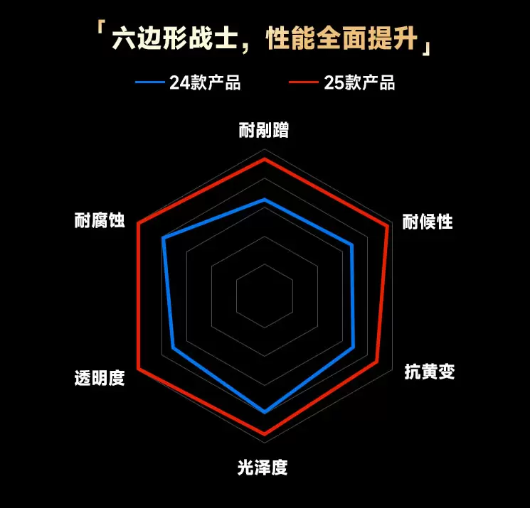 膜小二车衣运用独有的专利技术,升级涂层工艺,实现涂层与基膜分子级融合,极大提升膜面致密性。车辆的光泽度因此大幅提高。就基础款而言,涂层厚度增加20%,光泽度稳定在143.5(行业平均在140以下)。同时,搭载倍涂睿技术的车衣,抗黄变等级提升至5级,即便车辆长期处于复杂环境,也能有效抵御老化泛黄,长久维持亮丽外观。