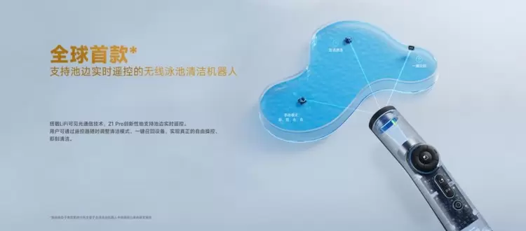 浪涌未来针对长期困扰行业的水下通信痛点,世界首发了“LiFi可见光通信技术”,并将其应用于Z1 Pro无线泳池机器人上,使其成为全球首款支持池边实时遥控的无线泳池清洁机器人。