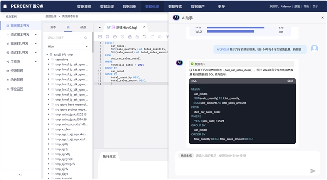 引入基于自然语言处理的AI开发助手,该功能支持开发者使用自然语言描述数据处理需求,系统即可自动完成SQL代码的智能生成、纠错、释义、优化等操作,经过简单的检查和调整,即可直接应用到实际的数据开发任务中。通过"自然语言即代码"的开发范式转变,使业务人员能够直接参与数据开发过程,大幅降低了技术门槛和学习成本,有效促进了业务与技术的深度融合。