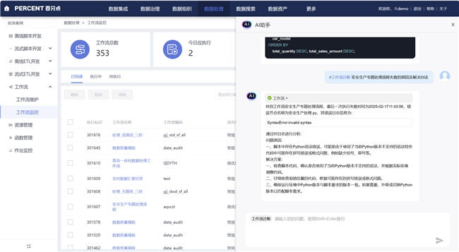BD-OS的数据运维模块深度整合大模型能力,实现运维管理的智能化升级。系统可对工作流执行过程中的错误日志进行多维度异常检测与分析,建立自动化监控预警机制,并提供智能诊断建议。当任务出现异常时,AI智能助手能够快速定位问题根源,精准识别错误类型,并推荐最优解决方案,使错误处理时间缩短至传统方式的1/4。通过减少人工干预、降低运维复杂度,该功能为数据团队提供了更高效、可靠的运维保障,有效支撑数据服务的稳定运行。