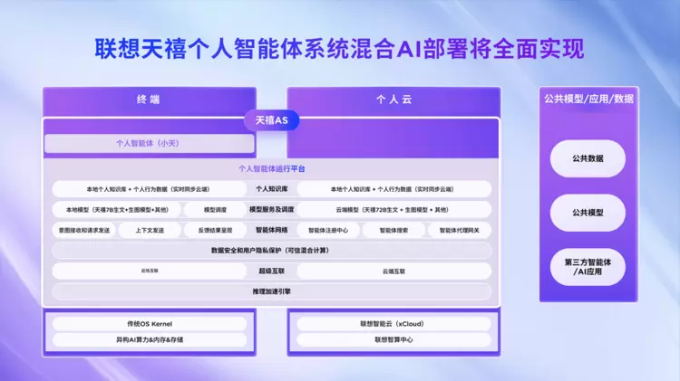 联想集团高级副总裁、中国消费业务群总经理张华透露,天禧AS将持续升级,今年5月,联想创新科技大会TechWorld上,天禧AS将首发基于个人云部署的DeepSeek大模型。他表示:“届时联想天禧AS,在端侧个人大模型、个人云大模型、公有云大模型,全面深度融合DeepSeek。联想天禧AS将实现创新的混合式AI部署,聚焦推动个人智能和企业智能的普惠。”这一混合式AI架构将整合公有云大模型的能力,结合异构算力、数据安全,及全栈解决方案,实现关键AI场景应用,加速落地并规模化。
