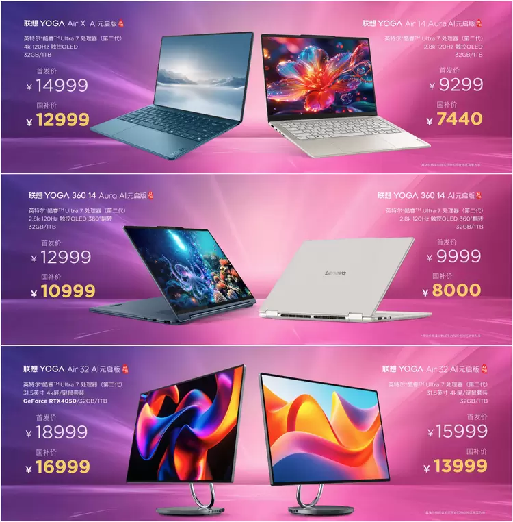 此次YOGA 带来的一系列新品以极具竞争力的价格与权益组合,为用户提供从硬件升级到服务保障的全方位支持。四款重点机型中,YOGA Air 14 Aura AI元启版国补后7440元;YOGA Air X AI元启版国补价12999元;YOGA 360系列中,YOGA 360 14 AI元启版国补价8000元;YOGA 360 14 Aura AI 元启版国补价格10999元。至于 YOGA Air 32一体电脑,更是以丰富的价格档位满足不同需求,其中集显版本国补后13999元;配备RTX 4050显卡的版本国补后为16999元。