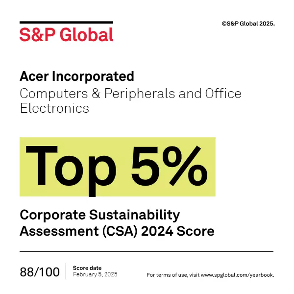 宏碁于2024年继续位列《S&P Global标普全球可持续发展年鉴》前 5% 公司之列。本次年鉴的评选涉及62个产业、7,690家公司,从中遴选出780家公司。宏碁于「社会(Social)」方面获得产业中最高分,并在客户关系、供应链管理和气候策略领域表现出色。此外,宏碁于2024 年也名列《时代》杂志全球最可持续发展企业阵列。
