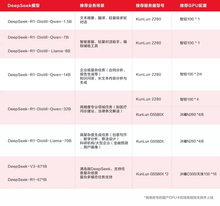 目前,昆仑技术公司多款服务器产品,如KunLun G5580X、KunLun 2280等,已全面完成与多种国产AI加速卡的深度适配工作。特别是针对DeepSeek模型,实现了高效支持,能够为各类客户提供更加丰富、灵活的DeepSeek部署解决方案。