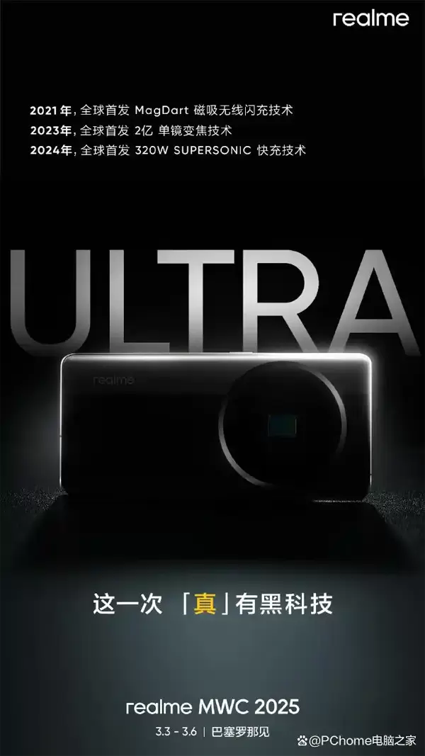 2025年2月27日,真我手机官微发布消息称,真我“Ultra级黑科技”即将在MWC 2025登场,“这一次,我们带着全新突破的黑科技而来”。