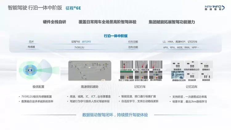 针对中高阶智驾渗透率的持续提升,四维图新基于地平线征程®6E打造的行泊一体中阶性能版智驾方案备受关注。该方案搭载7V3R12U极优传感器配置,通过数据运算融合,以80TOPS算力实现高速领航辅助NOP的全场景覆盖,以及记忆行车、记忆泊车等智能化升级。与此同时,该方案还构建了数据驱动的智驾闭环系统,通过数据合规、众源更新和持续迭代等技术手段,不断提升驾驶体验,满足用户个性化需求。