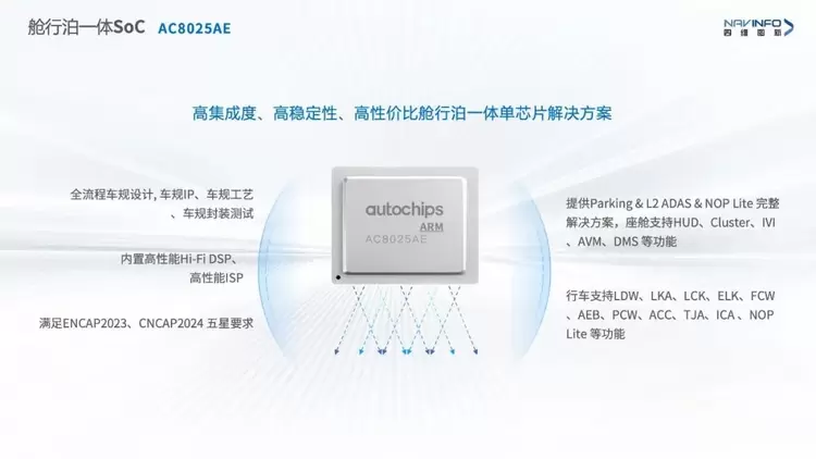 在舱驾一体产品方面,四维图新展示了基于SA8155P芯片打造的舱泊一体方案以及One Box舱驾一体产品。其中,SA8155P舱泊一体方案面向8-15万车型,极简配置,支持大屏流畅的多模态智能交互体验,实现了从信息娱乐、导航辅助到自动泊车的全面升级,对比同类型方案降本20%以上。One Box舱驾一体产品则是四维图新面向10万级市场推出的一款极致性价比产品。该方案采用四维图新旗下杰发科技自研的舱行泊一体单芯片解决方案AC8025AE,国产化率高达70%,实现了算力资源的精简配置与高效利用,全面支持智能座舱和智能驾驶应用。