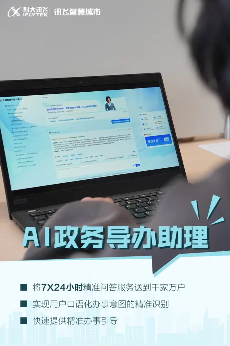 大模型能力的延展,同时也实现了政务线上服务的一体化革新。基于政务网、公众号等智能办事窗口,科大讯飞打造了轻量化的AI导办助理,以昼夜无休的7×24小时精准问答重构服务供给模式——基于大模型的意图理解和推理能力,实现用户口语化问题到办事意图的精准识别,通过多轮对话精准引导办事服务。政务办事不再来回跑,办事咨询不用多处问。
