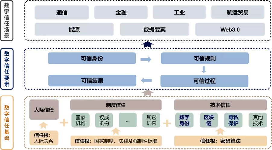 1. 数字信任是由多种方式组合而成的数字世界信任体系,是传统信任体系的数字化转型升级。从概念上看,数字信任是指在数字世界中,通过人际、制度、技术等一系列组合手段,在个人、组织等主体间构造稳定预期的能力。从表现形式上看,数字信任利用数字身份、区块链、隐私保护等技术,通过数学原理和代码建立信任关系,为互联网经济社会活动提供数字化信任服务。从架构上看,数字信任体系由数字信任基础、数字信任要素和数字信任场景组成,共同支撑实现数字空间中人、组织、设备之间的相互信任。