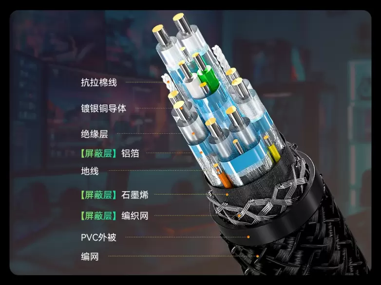 镀银导体:采用高纯度镀银铜导体,相较于传统铜线,其电阻率降低了30%,即便在4K@240Hz的高刷高帧率下,也能保持信号的纯净与稳定,有效减少画面拖影与色差,提升暗部细节表现力,为您的游戏世界增添更多真实感。