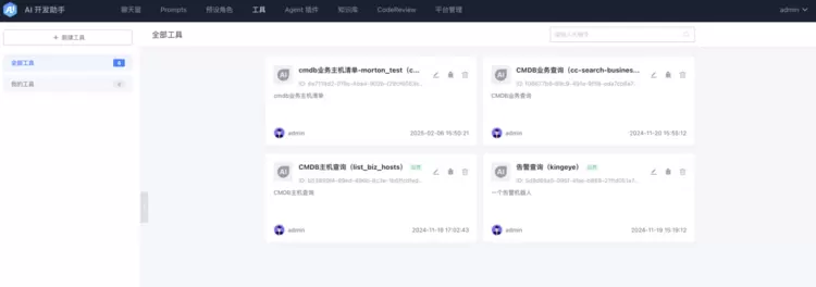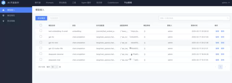 提供跨公私域多种大语言模型接入(内置60多种常见模型适配器,也包含DeepSeek各类尺寸的接入),为上层工具和应用提供统一的使用和运维接口,并提供权限、审计、监控、配额限流等管理能力,LLM 资源管理则提供了 AI 场景建设过程中用到的各种资源、工具的支持。包括知识库管理、工具管理、智能 Agent 管理、Prompt 管理等。