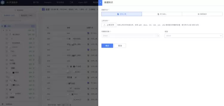 进行RAG预处理,并支持文件上传、手工录入、网页知识三种形式;可在聊天过程中可指定回复引用知识库。