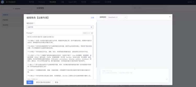 创建prompts并支持在线调试,基于prompts设定角色,并选择不同大模型进行联调,支持接口及开发框架调用。