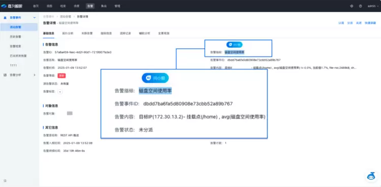当发生告警时,观测助手可主动提供此对象以及与此对象相关的其他对象的指标/日志/Trace/拓扑等信息,供IT运维人员进行故障诊断定位。