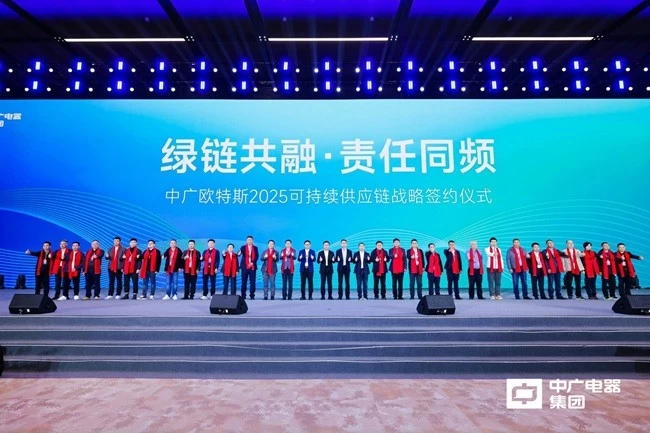 绿色供应链在推动中国绿色低碳转型、应对气候变化、推进供给侧改革等方面,都是非常重要的抓手。在中国制冷空调工业协会副秘书长马广玉的见证之下,中广电器集团代表与浙江美芝压缩机有限公司、丹佛斯自动控制管理(上海)有限公司、浙江三花商用制冷有限公司、浙江英特科技股份有限公司、江森自控日立万宝压缩机(广州)有限公司等多家中广绿色供应商伙伴代表,共同签订“中广欧特斯2025可持续供应链”战略,共建绿色供应链体系、共融协同发展生态圈,保持社会责任与合规治理责任同频,助力产业链全面升级。