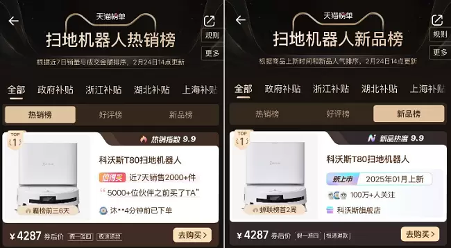 自2025年1月上市以来,科沃斯地宝T80便以黑马之姿席卷天猫扫地机器人热销榜、新品榜双榜首,截至2月24日,单一平台累计销量突破5000+台,是2025年目前销量第一的扫地机器人,与此同时,科沃斯连续10年中国市场销量第一。