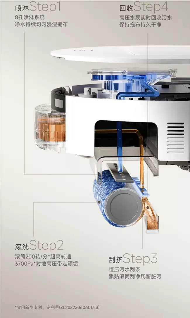 OZMO ROLLER 恒压活水洗地技术获得实用新型专利(专利号 ZL202220606013.3),喷淋系统实时补水,结合3700Pa高压与200转/分滚筒,实现“滚擦+刮污+回收”三链路清洁,据权威科技媒体中关村在线实测显示马克笔、食用油等重污渍“一滚即净”。