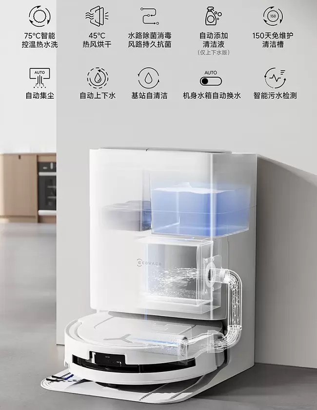 75℃智能控温热水洗拖布、99.99%风路抗菌、45℃热风烘干,搭配自动上下水模块,实现“150天免维护”,全面解放双手。