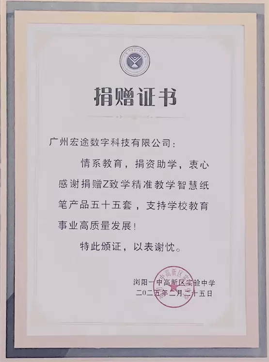 2月25日,广州宏途数字科技有限公司向浏阳一中高新区实验中学捐赠宏途Z致学智能手写笔教学系统的仪式在该校隆重举行。科技赋能教育,爱心点亮未来,校企双方代表齐聚一堂,共同见证了这一助力教育数字化发展的善举。