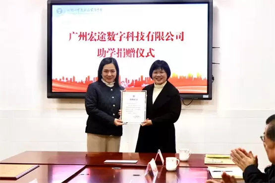 仪式上,广州宏途数字科技有限公司运营中心负责人罗岚代表企业,向学校捐赠宏途Z致学智能手写笔教学系统五十五套,并接受学校授予的证书与牌匾。该系统依托宏途在教育信息化领域的核心技术,旨在通过数字化工具减轻教师教学负担,提升学生学习效率,助力学校实现教育质量的全面提升。罗岚在发言中表示:“作为社会企业,支持教育发展是我们的责任。希望通过此次捐赠,为学校培养更多德才兼备的未来栋梁提供科技支持与创新动力。”