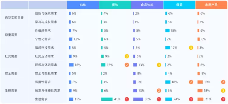 1)餐饮、食品饮料、母婴、家用产品的消费,最希望被满足的都是最基础的生理需求