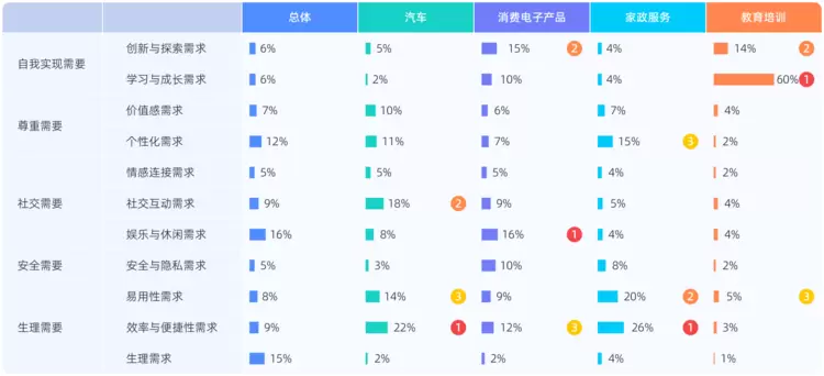家用产品的消费,主要满足更偏基础层次的需求——生理需求、易用性需求和效率与便捷性需求。此外,对安全与隐私的关注度也高于总体水平。家是一个能够完全放松、休息的港湾,因此,用户脱离了职场/社会的紧张和压力后,需要回家能放心使用家用产品,享受便捷与安全。