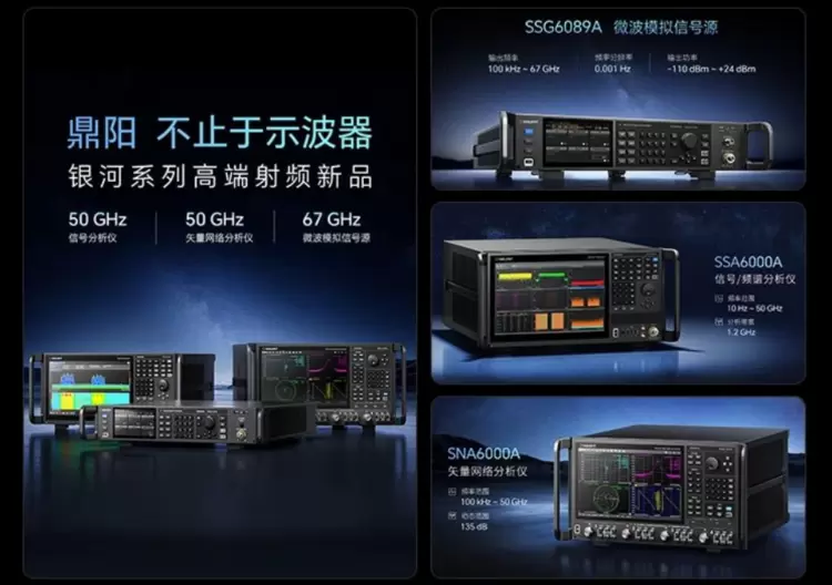 鼎阳科技一直深耕于通用电子测试测量仪器行业,近年来在射频微波领域也取得了巨大突破。2024年,鼎阳科技发布67 GHz模拟信号源SSG6089A、50 GHz矢量网络分析仪SNA6000A 、50 GHz信号分析仪SSA6000A及适配软件,展示了在射频领域的强劲实力。