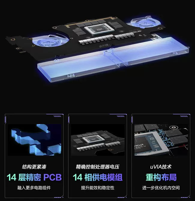 ROG幻X 2025精心打磨了内部布局,集成了更多电器元件,同时主板尺寸较上代减小约15.5%,为容纳更大的电池与风扇留足了空间。主板用料采用14层PCB,结构更加紧凑,14相供电模组精确控制处理器电压,性能输出更稳定。