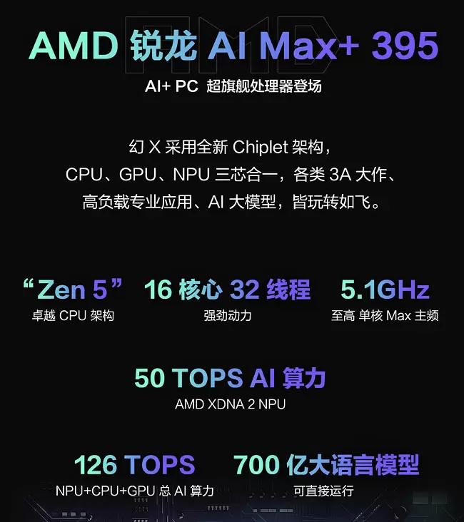 ROG幻X 2025首发至高搭载AMD 锐龙 AI Max+ 395处理器,16 核 32线程,单核加速频率至高5.1GHz,集成40CU AMD Radeon 8060S集显,性能已经超越了RTX4060级别的独显。还有个特别之处,它支持 256GB/秒大带宽,结合同等级领先的 50 TOPS NPU AI 算力,可以轻松运行本地 AI 模型,像本地 70B(700亿)参数的大模型都能跑,而且使用本地 AI 大模型使用,不仅更加便捷,还能确保数据的安全性。