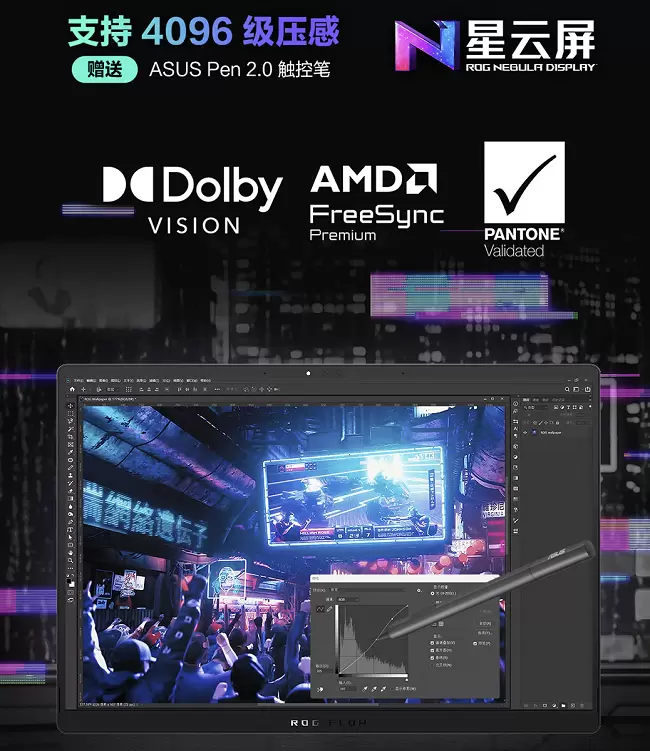 ROG幻X 2025还配备有13.4英寸触控星云屏,2.5K分辨率+180Hz刷新率,屏幕观感细腻丝滑;支持4096级压感触控并附赠ASUS Pen 2.0触控笔,创作如行云流水;100% DCI-P3色域覆盖,出厂校色支持四种专业色域切换,潘通色彩认证,色彩精准度媲美专业显示器;500nits高亮度+1500:1对比度,DXC抗反射涂层加持,户外强光下画面依旧清晰。