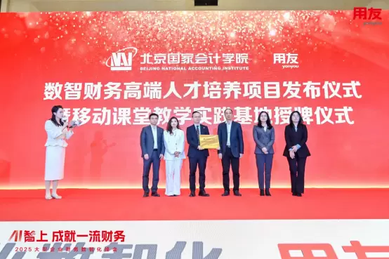 北京国家会计学院和用友网络基于战略合作,为企业财务数智化乘AI之风走向更高的应用维度携手向前,双方将在企业财务数智化转型方面进行积极有效的探索。2025年,北京国家会计学院已联合用友一同开启高端人才培训班项目,并正式就双方 “移动课堂教学”项目为用友授予“实践基地”铜牌。双方将从政策理论、方法体系、技术路径到实践应用,全方位加强理论合作、赋能财务人才,助力企业实现精益化、系统化的财务管理升级,迎接智能时代的新机遇与新挑战,推动高质量发展。