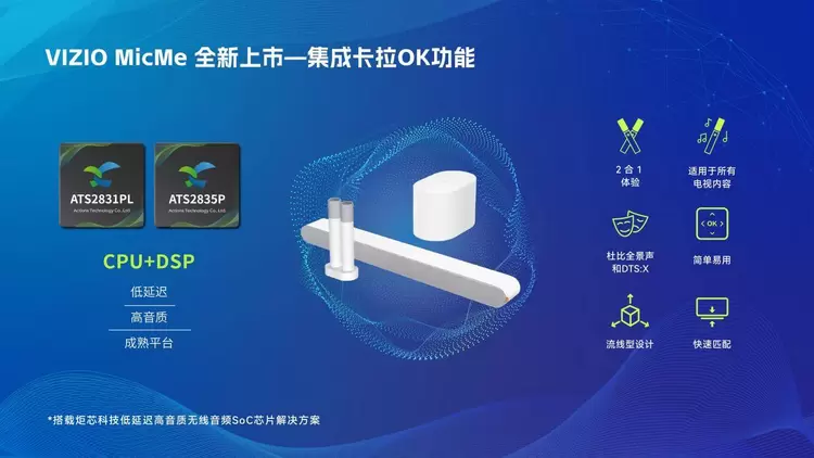 VIZIO MicMe 的Soundbar内搭载了炬芯科技高音质蓝牙音频芯片ATS2835P用于接收蓝牙音频;与此同时,无线麦克风主控芯片采用了炬芯科技低延迟高音质无线音频SoC芯片ATS2831PL。