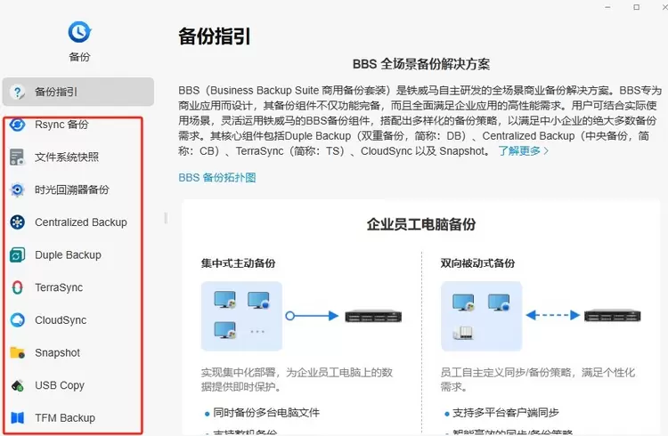 铁威马TOS系统打造的智能防护体系,让数据安全从被动防守转向主动防御。铁威马提供BBS全场景备份解决方案,其中,双重备份实现铁威马备份服务器中的数据异地容灾备份;中央备份将企业内部员工电脑、文件服务器、虚拟机等数据集中备份到本地的铁威马备份服务器中;TerraSync能实现多台备份服务器之间、备份服务器与电脑间的数据同步等。齐全的备份工具给足安全感,让人直呼“备份,就选铁威马”。