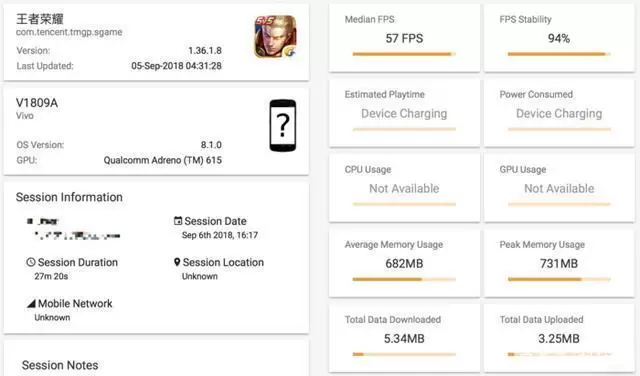 以流行手游《王者荣耀》为例,科技犬采用了GameBench对vivo X23进行游戏帧率记录,测试时间为27分钟。从测试的数据上看,vivo X23的游戏帧率比较稳定,平均帧率57fps,帧数稳定率达到了94%,游戏过程中除了参团和打开装备界面略有掉帧之外,其他时候相当稳定和流畅。