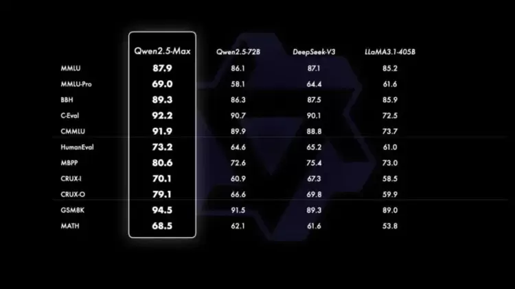 此外,在Arena-Hard、LiveBench、LiveCodeBench 和 GPQA-Diamond 等基准测试中,Qwen2.5-Max 的表现领先。同时在MMLU-Pro 等其他评估中也展现出了极具竞争力的成绩。