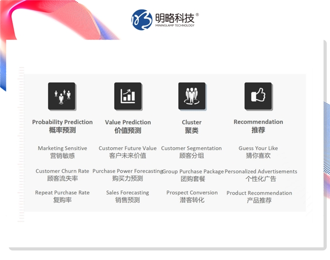 在拥有标签和海量内容后,如何将它们匹配起来?除了依靠过往的业务经验,明略科技还提供了算法工具,面向业务人员,使工具更易用,效果更佳。算法工具中预设了多种预集成算法,包括概率预测、价值预测、聚类、推荐等,以支持业务增长。