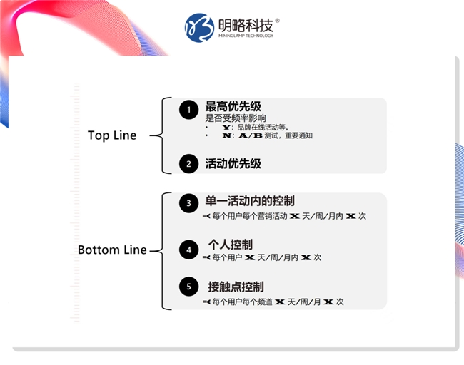 明略CDP+MA采取了立体式评估和控制方法,设置哪些活动参与,哪些不参与,并确定参与活动的优先级顺序。同时,从横向层面切割每个活动内的控制,为不同触点设置发送上限,以确保在有限的沟通机会中,将机会分配给最关键活动。