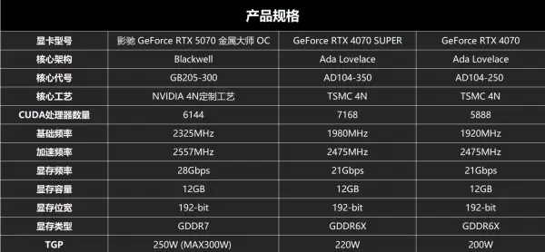 首先是影驰 GeForce RTX 5070 金属大师 OC与GeForce RTX 4070 SUPER和GeForce RTX 4070的规格参数对比: