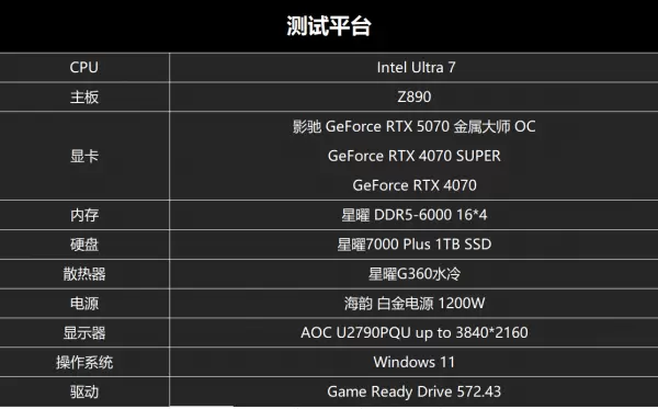 针对本次游戏测试,将选取GeForce RTX 4070、GeForce RTX 4070 SUPER以及影驰 GeForce RTX 5070 金属大师 OC进行。游戏方面选择已支持NVIDIA DLSS 4技术的《赛博朋克 2077》、《漫威争锋》与《心灵杀手 2》三款不同类型的游戏大作。进行NVIDIA DLSS技术开启前后的帧数对比——GeForce RTX 4070和GeForce RTX 4070 SUPER将开启DLSS 3模式,影驰 GeForce RTX 5070 金属大师 OC 将开启DLSS 4多帧生成技术。游戏将选取1080P/2K/4K三个分辨率下分别进行,游戏图像设置均设置最高画质,开启光线追踪技术,以实现最大限度释放显卡的全部算力潜力,反映其在面对高规格游戏时的真实表现。