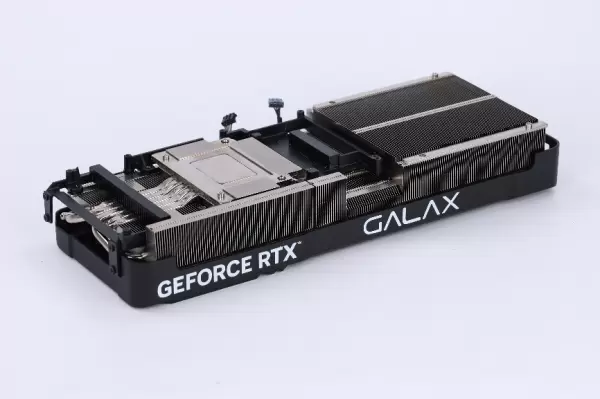 显卡上盖采用铝合金一体压铸成型工艺,整体为全覆盖式的金属盔甲。这一设计不仅赋予显卡极佳的质感和坚固度,还兼具了辅助散热的作用。背板同样为全金属加固设计,防止PCB因显卡自重而弯曲变形,并保护背面的元件不受外力损伤。本次测试采用的影驰 GeForce RTX 5070 金属大师 OC,采用了简约的撞色设计组成,辅以银色边缘点缀和CNC切割的亮面倒角,使显卡既保留了金属大师系列标志性的质感,又在细节处彰显更为精致的感觉。这种设计语言低调而不失高级,相信能迎合很多玩家对美学和个性的追求。