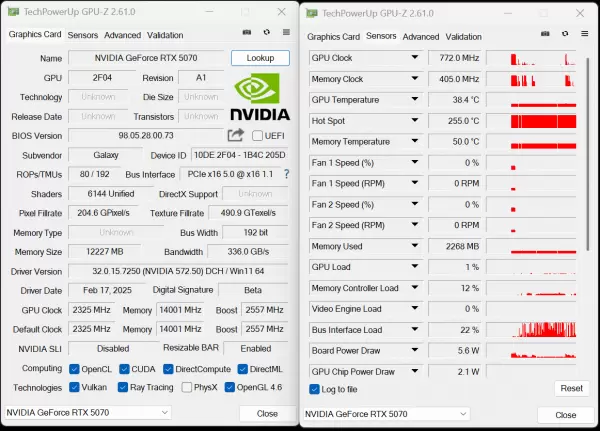 根据GPU-Z,可看到影驰 GeForce RTX 5070 金属大师 OC具体的参数表现和实际规格。在待机状态下,该卡温度为38.4℃,功耗仅为5.6W。