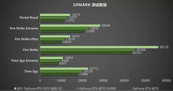 首先使用3D Mark软件对GPU进行基准测试,从测试结果上来看,耕升 GeForce RTX 5070 踏雪 OC在多个数据指标上与GeForce RTX 4070 SUPER和GeForce RTX 4070相比均有明显的性能提升。在Fire Strike测试中,耕升 GeForce RTX 5070 踏雪 OC的分数高达56123分,而在Port Royal测试中,其14215分的得分与前代显卡的12707分和11370分形成显著对比,实现25%的增幅。而耕升 GeForce RTX 5070 踏雪 OC在Time Spy Extreme中也拥有10850分,彰显出其优秀的表现。总体来看,耕升 GeForce RTX 5070 踏雪 OC不仅在性能上拥有增幅,而且其强大的基础配置也充分满足内容创作者和游戏玩家的需求。