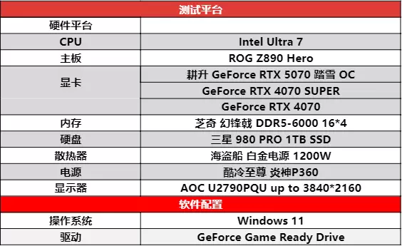 本次测试将采用以下配置:CPU选用Intel Ultra 7,搭配ROG Z890 HERO主板,内存方面搭载了4条芝奇 幻锋戟 DDR5-6000Hz 16GB内存条,电源方面则采用了海盗船 白金1200W电源,散热部分则使用了酷冷至尊 炎神P360一体式水冷。这套配置为耕升 GeForce RTX 5070 踏雪 OC提供了一个稳定的性能输出环境,使其能够充分发挥出强大的性能潜力,满足玩家与创作者对性能的需求。