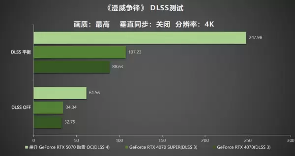 在4K分辨率下,耕升 GeForce RTX 5070 踏雪 OC关闭DLSS,平均帧数达到61.56帧。而开启DLSS 4技术后,可以明显的观察到多帧生成技术的支持让耕升 GeForce RTX 5070 踏雪 OC的帧率提升至247.98帧,相比GeForce RTX 4070 SUPER高131%,比GeForce RTX 4070高179%。此外,游戏在光线追踪技术的加持下,显著提升了画面真实感,给玩家带来了更加真实的沉浸体验。借助DLSS 4技术的加持,搭载,耕升 GeForce RTX 5070 踏雪 OC的玩家可以享受到画质与帧数兼备的游戏体验。