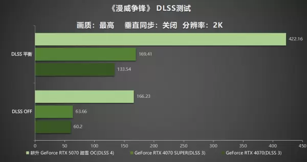 在1080P分辨率下,耕升 GeForce RTX 5070 踏雪 OC凭借自身性能可以轻松面对《漫威争锋》,帧数为186.23帧。而在开启DLSS 4 平衡模式后,其拥有202%的超大涨幅,直接高达563.18帧。借助NVIDIA DLSS 3技术,GeForce RTX 4070 SUPER平均帧数为210.83帧,GeForce RTX 4070平均达到180.71帧,也能够实现流畅的游玩。