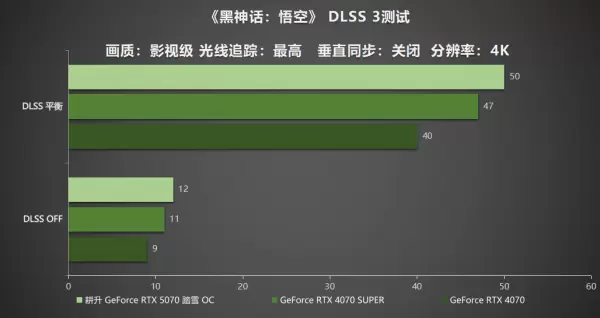 在4K分辨率下,《黑神话:悟空》对显卡性有了更为严苛的要求。GeForce RTX 40系列的两款显卡的平均帧数,均只有11帧和9帧。耕升 GeForce RTX 5070 踏雪 OC在DLSS关闭时也只能达到12帧。可见该卡作为一张2K定位的显卡,在还未支持DLSS 4技术的《黑神话:悟空》中,还是比较吃力的。当开启DLSS平衡模式后,三者帧率提升的幅度相当显著。耕升 GeForce RTX 5070 踏雪 OC在开启DLSS 3技术后,相较DLSS关闭时拥有近31%的性能提升,其帧率平均可达50帧。