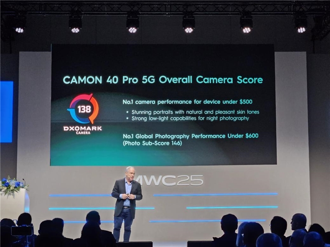 DXOMARK首席执行官Frédéric Guichard先生在MWC 2025 TECNO AI生态产品发布会上表示:"CAMON 40 Pro 5G在DXOMARK严苛测试标准下,展现出了无与伦比的影像表现力与卓越性能。我们对其拍照表现尤其印象深刻,它是600美元以下设备中表现最好的,也是首款符合我们2025年‘Smart Choice智选’标志的智能手机。”